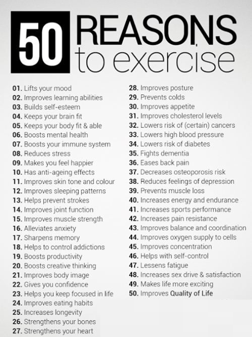 Exercise is ESSENTIAL for a healthy me and you. It’s important to remember that not every day of exercise needs to look the same, but it is important to always put one foot in front of the other. If you read in my first post, you will find out that I did not used to be a runner. I played sports my whole life, but running for fun was definitely not a thing. Now, I can’t even begin to tell you what freedom and joy I find in running, whether it be 1 mile or 13.1. I will leave you today with 50 reasons to exercise and I hope it will inspire and motivate you to GET MOVING!